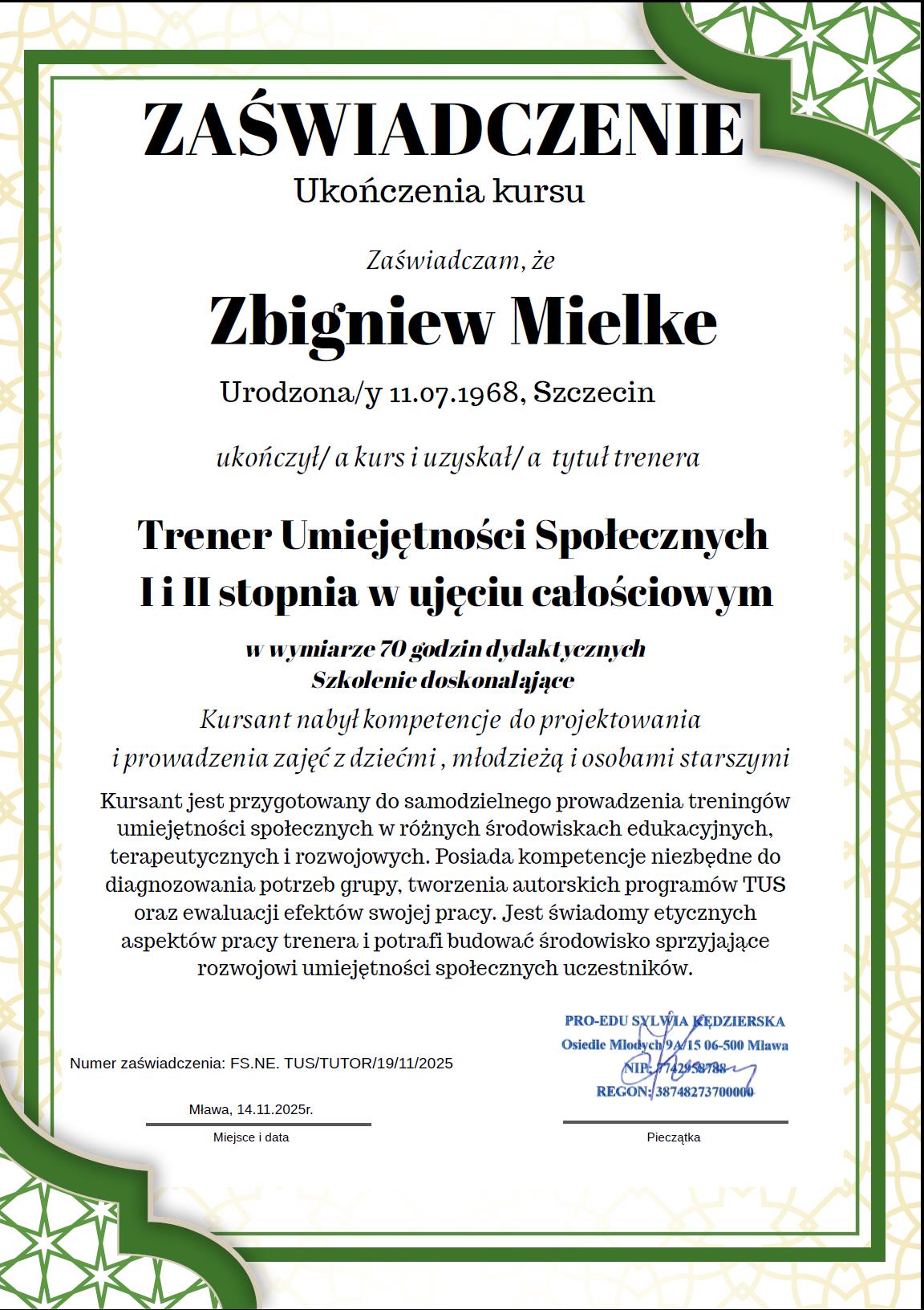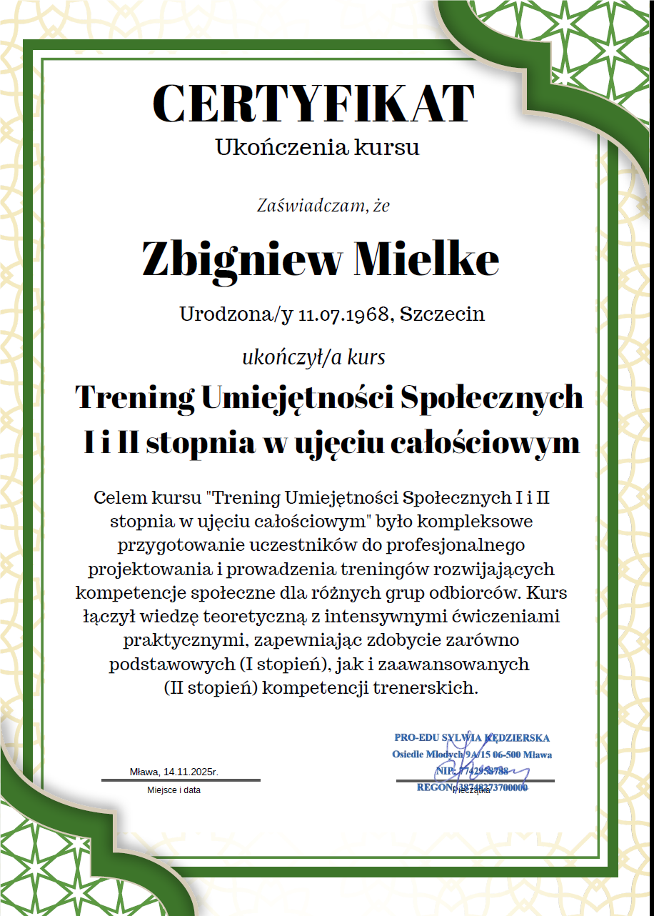 Jestem certyfikowanym trenerem uważności i współczucia w nurcie psychologii kontemplatywnej, ukończyłem studia; „Professional Training in Contemplative Psychology and Mindfulness”, Mam też przygotowanie pedagogiczne.